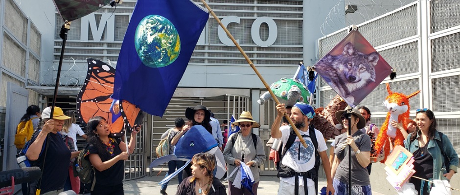 Actualización, 18 de junio: en el día 95 de su caminata, Pancho caminó los últimos 5 kilómetros con personas que portaban banderas de la Tierra, figuras y estandartes de especies migratorias, evocando la naturaleza sagrada de la migración. La culminación de la caminata iba a ocurrir durante la Primera Asamblea de los Pueblos, Barrios y Comunidades de la Región de San Diego – Tijuana, en el Centro Cultural de Tijuana (CECUT), organizado por Sonia Deotto y Haydé Murakami de OraWorldMandala. Mientras cruzaba la disque “frontera” estadounidense / mexicana el 15 de junio, él subió la puerta giratoria de metal y ató una bandera pequeña de la Tierra en el alambre de púas.